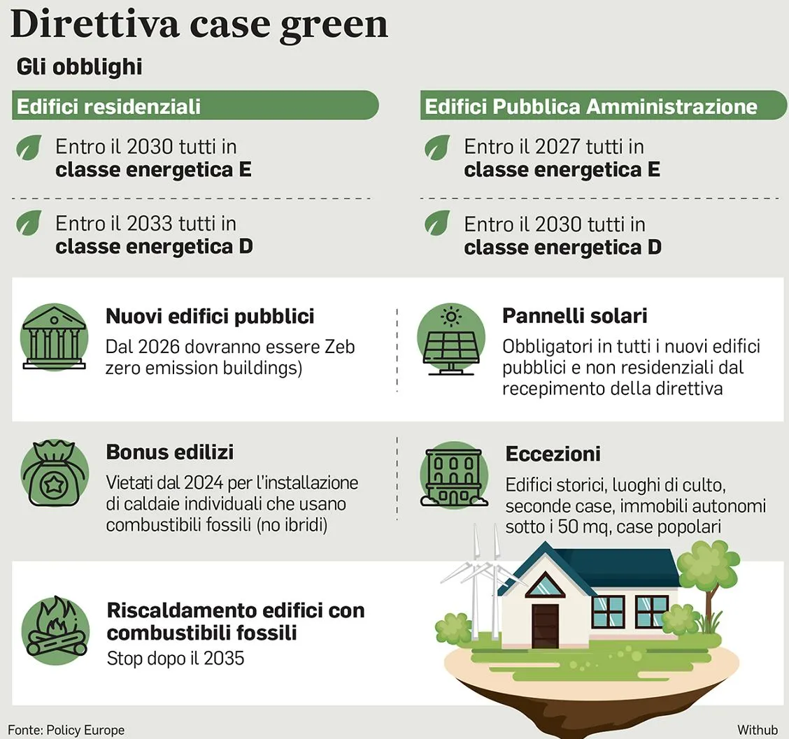Per rendere possibile la riduzione delle emissioni, la direttiva Casa Green prevede una differenziazione fra immobili pubblici e residenziali così come fra edifici di più recente costruzione e edifici più datati.